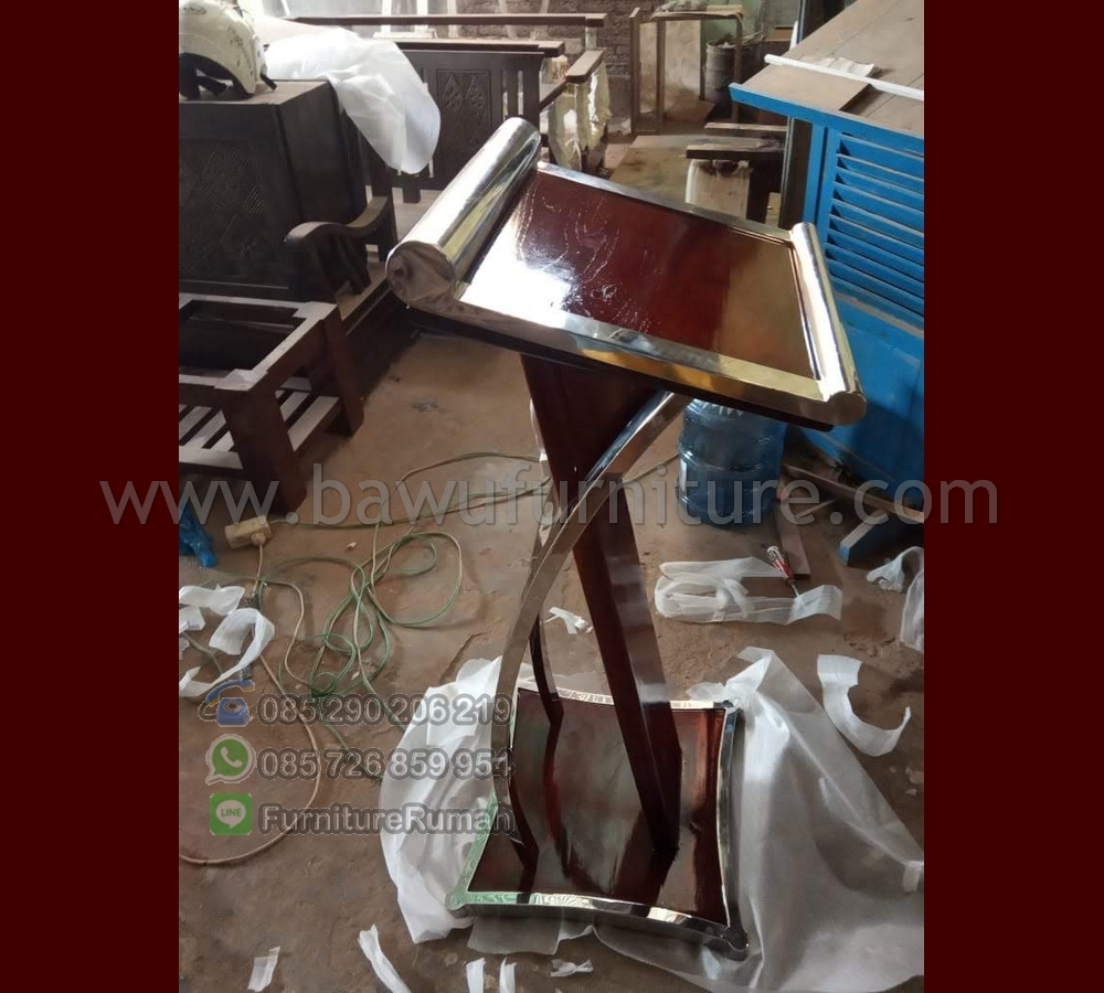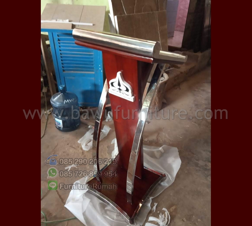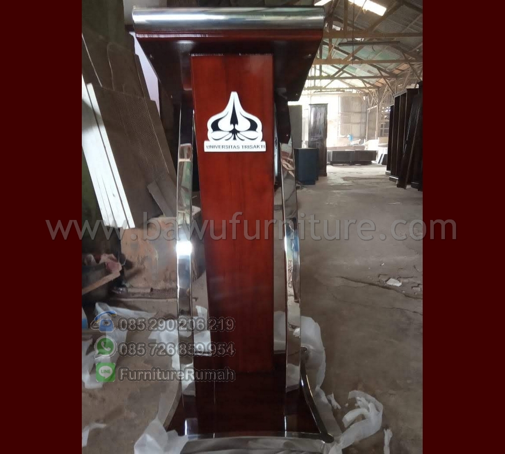 Harga Podium Minimalis, Salah satu produk unggulan kami dengan model Minimalis yang sangat popular ini menjadikan produk yang mewah dan modern, dengan adanya produk Mimbar Stainless / Podium Minimalis ini menjadikan produk kami menjadi salah satu penjual yang paling kompeten dalam menjual Produk Mimbar Minimalis Stainless untuk kebutuhan – kebutuhan Pidato maupun ceramah dalam berbagai acara, salah satunya produk kami ini yang mana dipercaya oleh salah satu Kampus Universitas Trisaksi yang terkenal di daerah Grogol Jakarta yang sangat diidolakan oleh beberapa calon Mahasiswa yang ada di berbagai daerah setempat. dengan menggunakan desain Minimalis pada Podium Stainless ini menggunakan Balutan Kayu Jati pada bagian Inti tengahnya dan dengan Keliling Stainless Steel menjadikan Produk yang sangat Istimewa dan Modern, tidak lupa kami memberikan Logo untuk Salah satu Kampus dengan Logo TRISAKTI menjadi lebih elegant lagi. sebagai identitas pada Universitas tersebut. jangan lupa juga untuk Calon Mahasiswa jika ingin kuliah pada kampus tersebut karena keunggulan yang dihasilkan sangat kompeten di bidangnya.