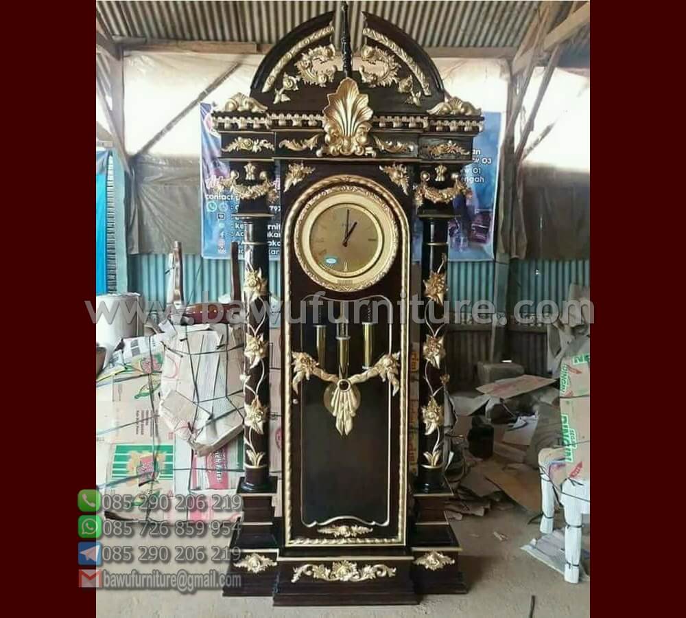 Merupakan salah satu produk furniture yang cocok untuk menjadi perabot pada ruang tamu di rumah impian anda. Dimana selain berfungsi sebagai petunjuk waktu, Lemari Jam Jepara ini juga dapat menghiasi interior ruangan. Pasalnya, desain ukiran khas jepara yang indah serta memiliki tampilan visual yang sangat mewah. Dimana lapisan cat duco warna hitam semi gloss mix warna emas membaluti furniture satu ini.