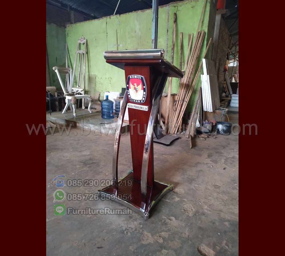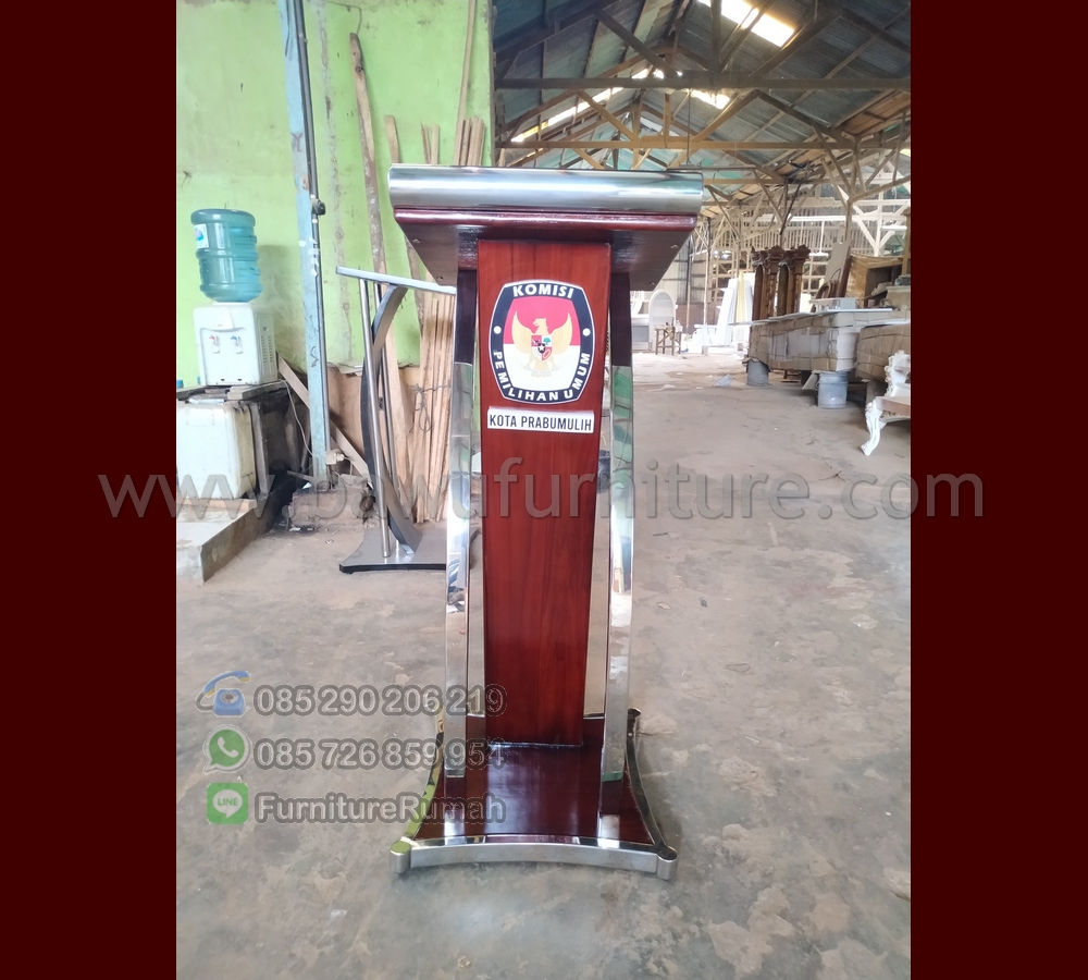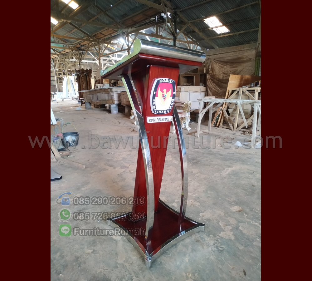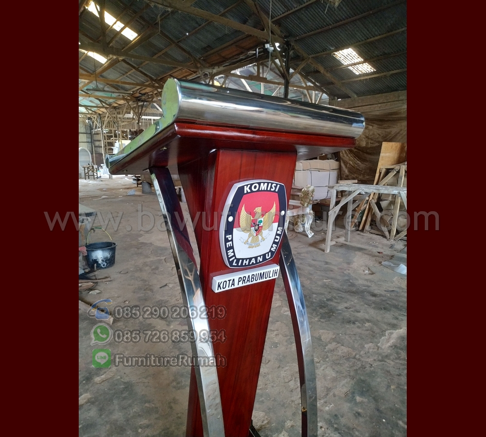 Podium Pidato Minimalis, sebagai sarana dalam penyampaikan naskah pada publik dalam suatu acara, maka Podium menjadi salah satu pilihan dalam berpidato dalam menyampaikannya. dalam hal ini kami dipercaya oleh pihak pemerintahan juga yang berdiri pada Komisi Pemilihan Umum ( KPU ) yang berada di Kota Prabumulih sebagai penyedia produk Mimbar Podium Pidato Minimalis sebagai sarana dalam menyampaikan Pidato tersebut. karena dengan adanya penambahan Logo tersebut menjadikan produk dari Kami sering digunakan oleh pemerintahan maupun Universitas yang ada di Indonesia saat ini, karena desain yang kami gunakan pada Podium ini menggunakan Bahan baku Utama Kayu Jati solid dengan Balutan Kombinasi Stainless Steel pada setiap sisi atas dan bawahnya, jadi kami juga menjual produk Mimbar Minimalis ini sesuai pesanan untuk pengerjaan Podium Pidato Minimalis.